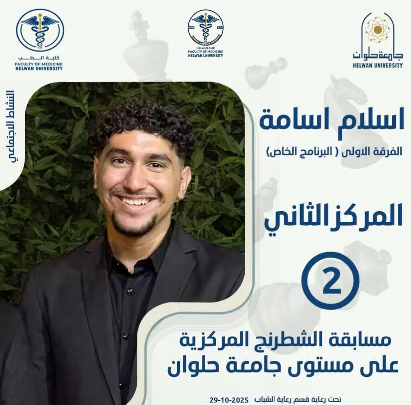 Under the patronage of Prof. Dr. Rasha Refai, Dean of the Faculty of Medicine – Helwan University, and Prof. Dr. Samah Bastawy, Acting Vice Dean for Education and Student Affairs, first-year student Islam Osama (Special Program) achieved second place in the Central Chess Competition at the level of Helwan University, which was held on 29 October 2025.