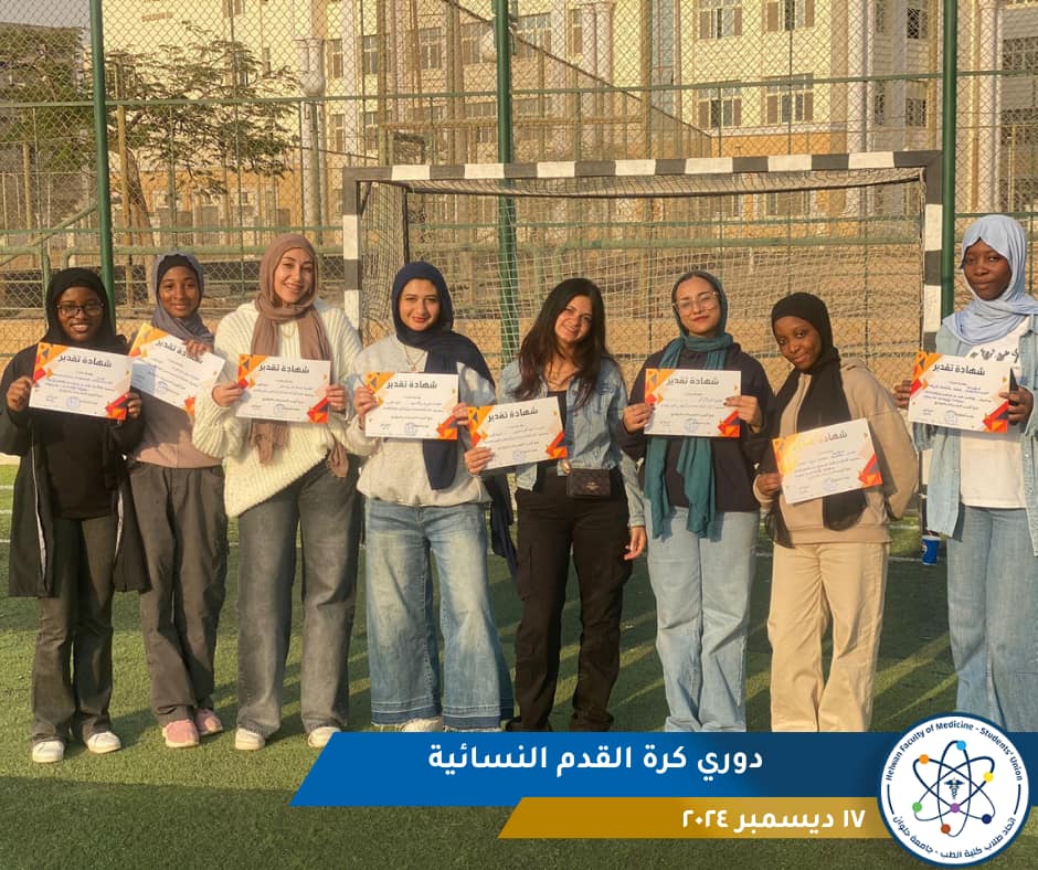 Under the patronage of Professor Dr. Sayed Kandil, President of Helwan University, and the leadership of Professor Dr. Waleed El-Sorougi, Vice President of the University, and under the supervision of Professor Dr. Rasha Refaie, Dean of the Faculty of Medicine and Vice Dean for Community Service and Environmental Development, the Faculty of Medicine's women's football team has successfully competed in the university football tournament. Their exceptional performance has garnered them significant recognition.